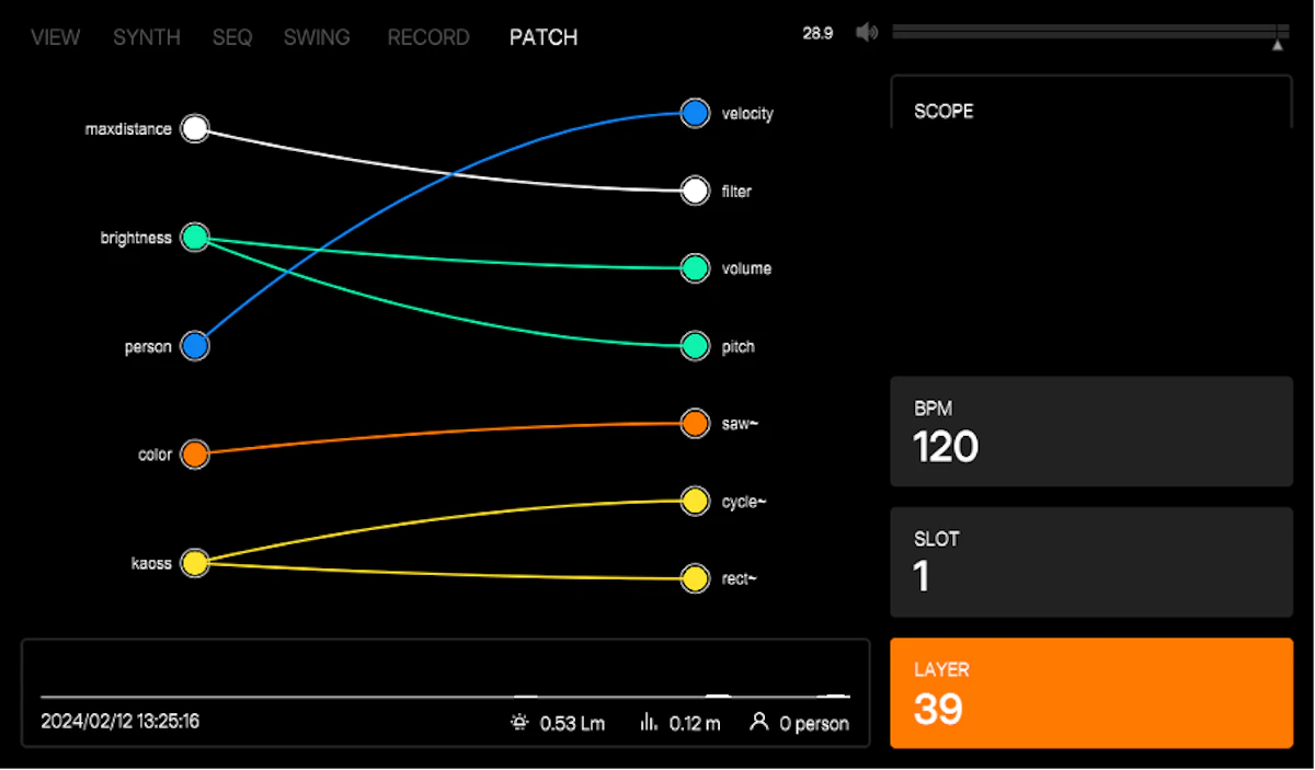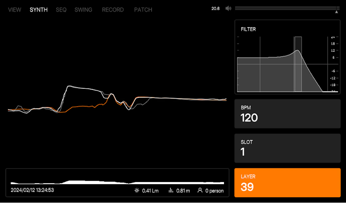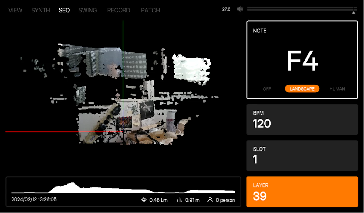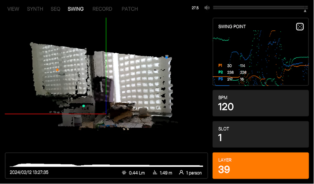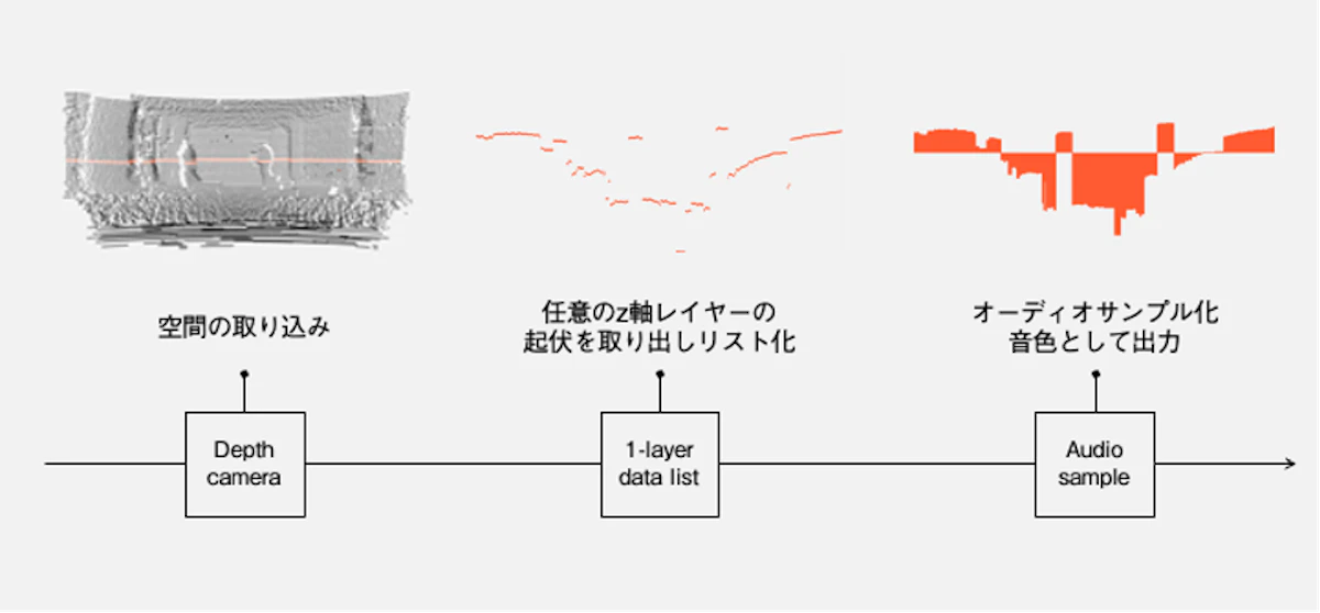 筐体には、測量や自動運転などに用いられるLiDAR というセンサーが搭載されており、空間の形状をリアルタイムに取り込んでいる。この取り込んだ空間形状から、任意のレイヤーの点群を取り出し、波形に変換することで音色を決定している。筐体の鍵盤の入力による各音階の固有周波数を合成することによって、その空間固有の音階を奏でる。