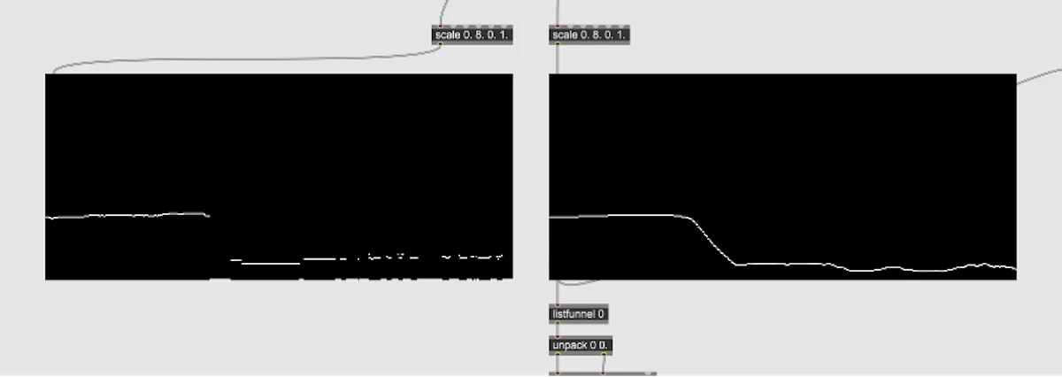 そこで、取得したリストに対して移動平均補間とフレーム間補間を行うmovingAverageLerp.jsオブジェクトを作成し、改善を図った。これによってクラック音や音の途切れといった不具合が無くなり、楽器を向ける方向を大幅に変えても滑らかに音が変化するようになっている。