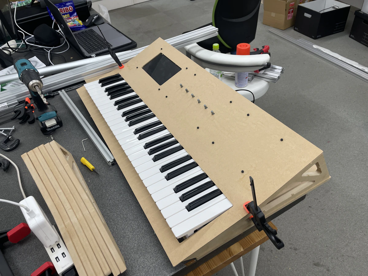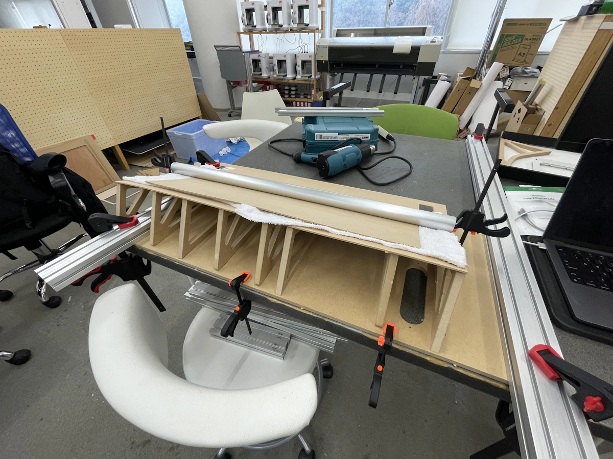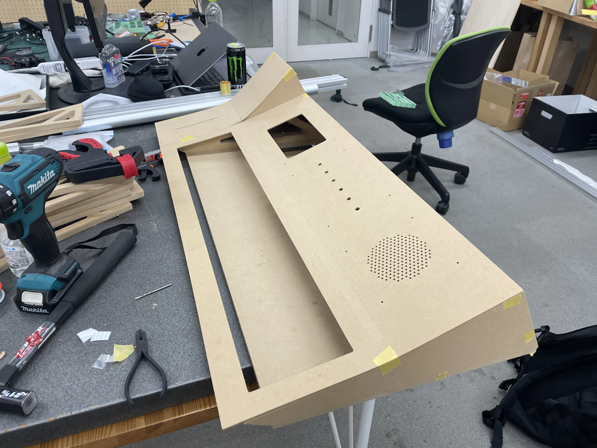 一番の課題は、トップパネルの曲線形状だった。当初アルミ板を用いる案もあったが、予算的に合わないのと本体の重量が重くなってしまうことから、加工のしやすいMDF板を用いて制作を行った。スチームアイロンと濡れ雑巾を使ってMDFを少しずつ湿らせながら曲げていき、曲線形状を維持できるように何度も実験を行い、最終的に理想としていた形状が出来上がった。