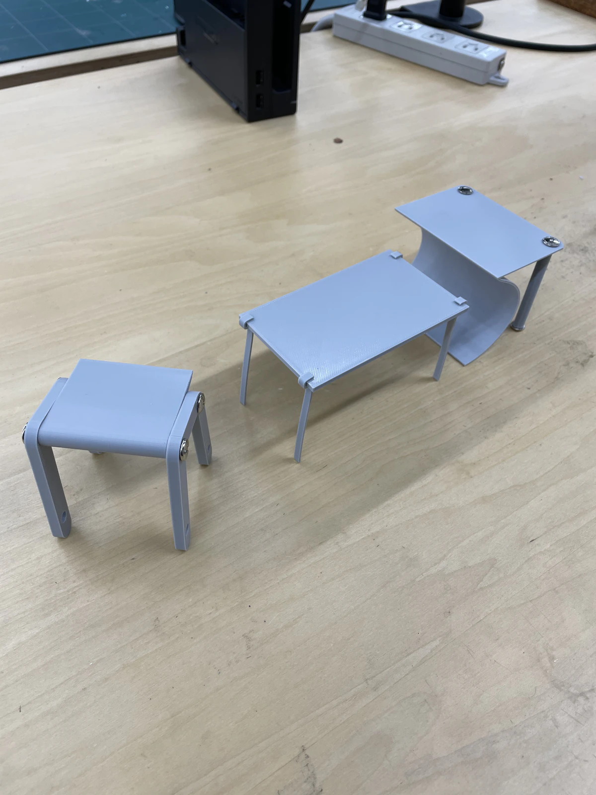 まず1/5スケールのモデルを作り、スイッチの機構や椅子としての佇まいを検討した。また、小型の椅子を用いた簡易的な実働プロトタイプを作ることで、用いるセンサーの選定や、どれほど踏み込むと切り替わった感覚が生まれるかなどを検討した。