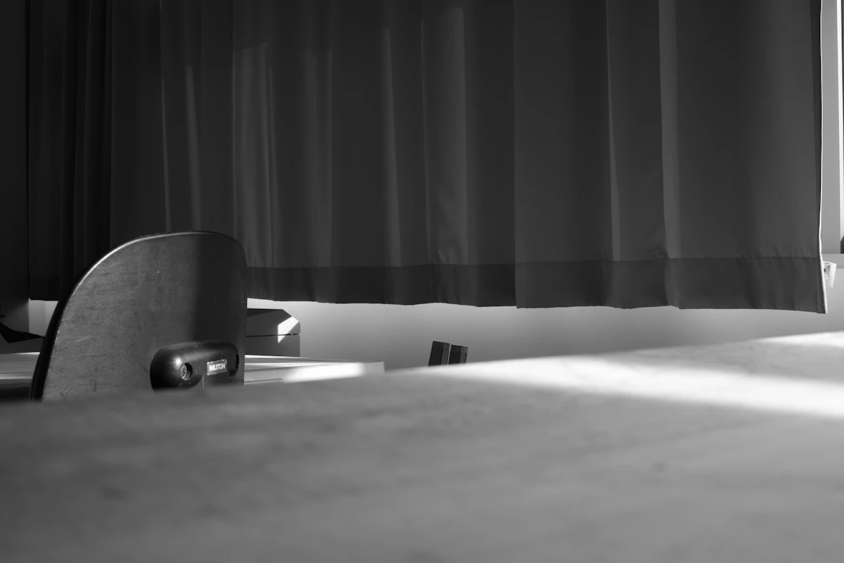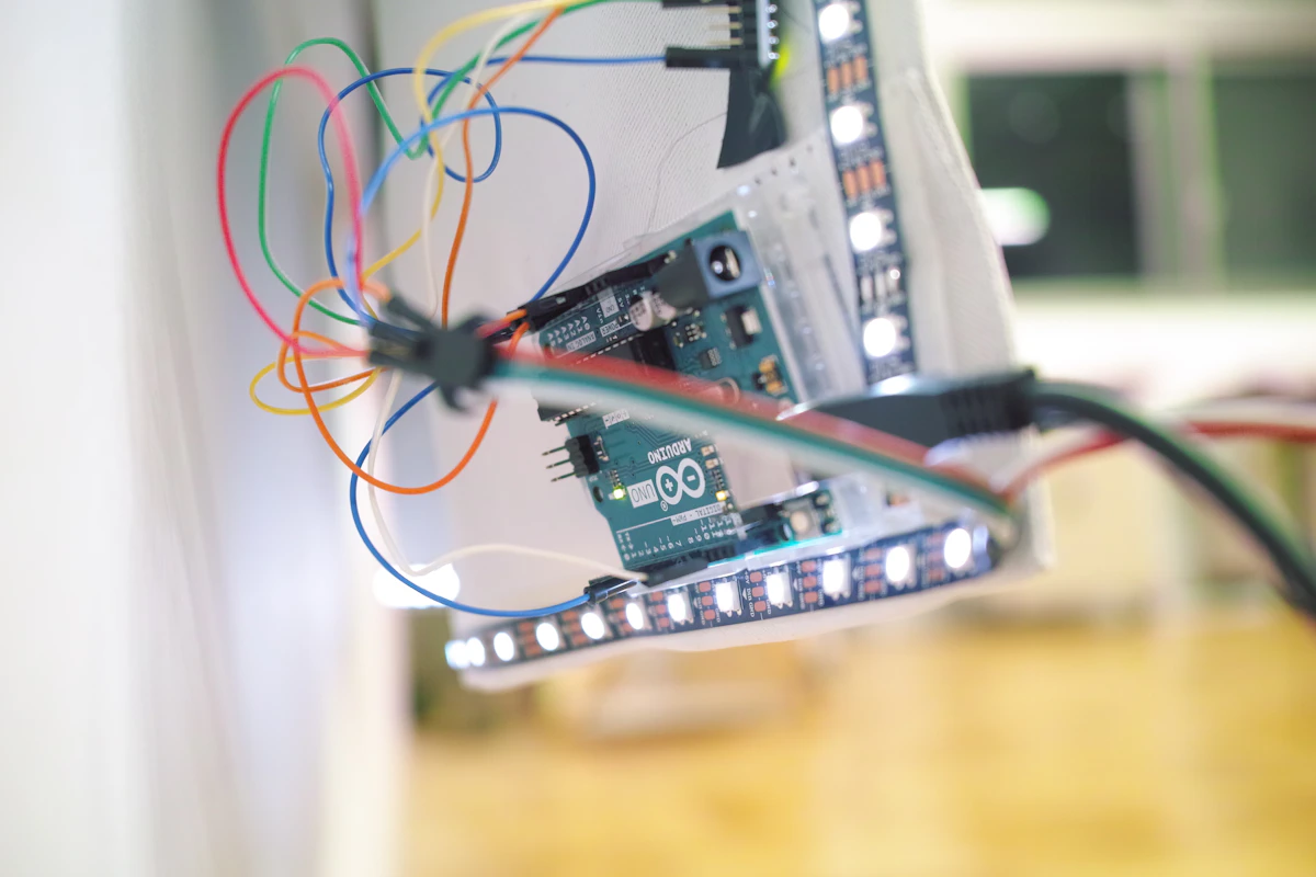 カーテンの下から溢れる光は、いわゆるその先に外があると感じさせるサインのようなものであると捉え、この光を再現し擬似的に「外」を生み出す照明を制作した。カーテンの縁にテープLEDと加速度センサーを配置し、Arduinoで制御している。カーテンが揺れると、光も自然と変化するようにした。