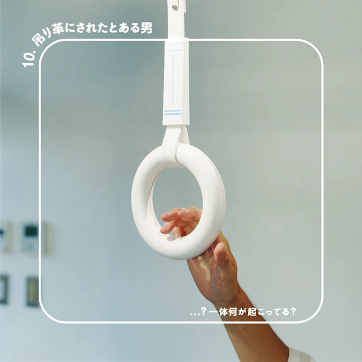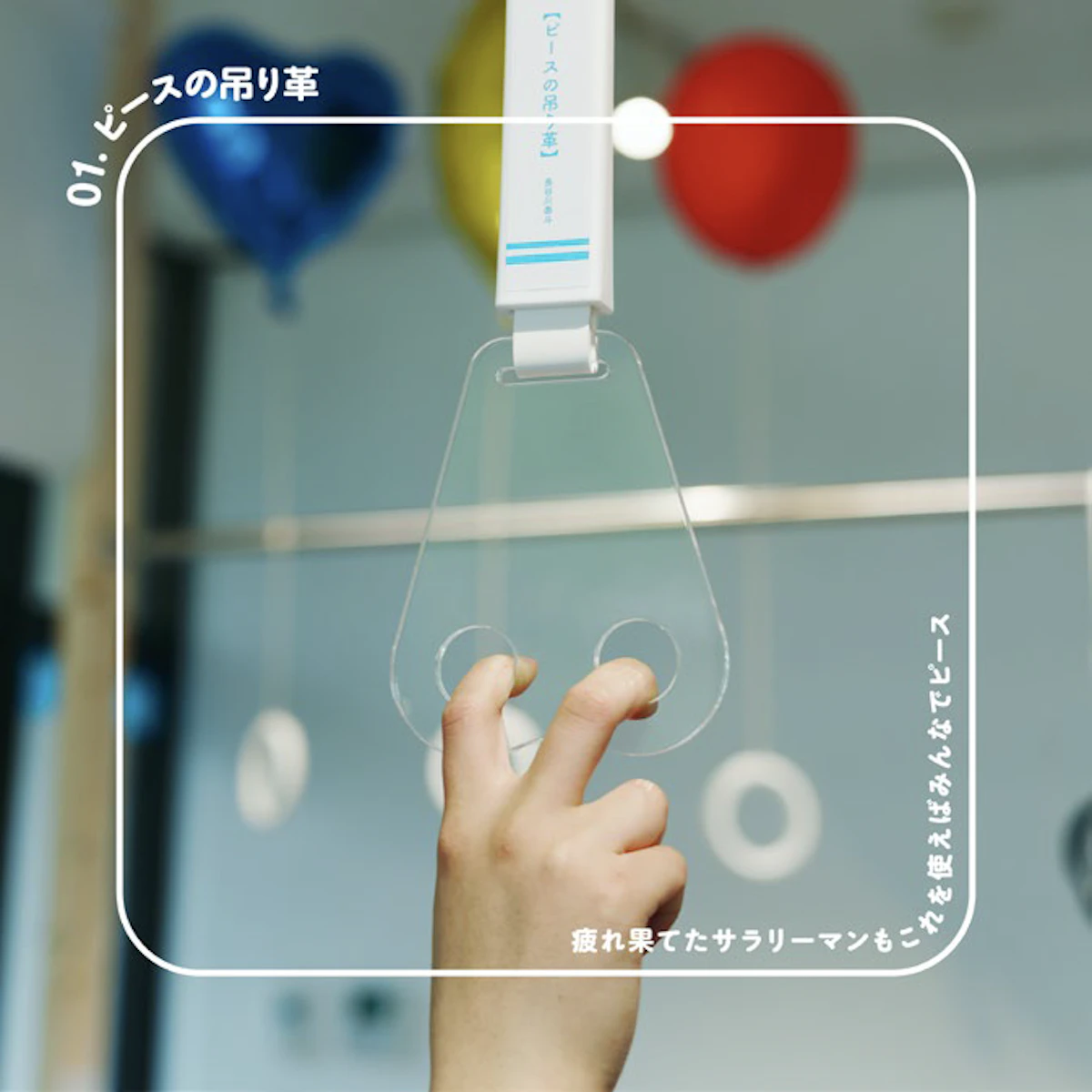 指をひっかけるとみんなピースになる吊り革。日本の平日夕方の電車はあまりに空気が重すぎる。仕事で疲れた人々が死んだ顔で吊り革を掴んでいるのを見て、せめて、せめて手だけでもピースしてくれ、と思って制作した。