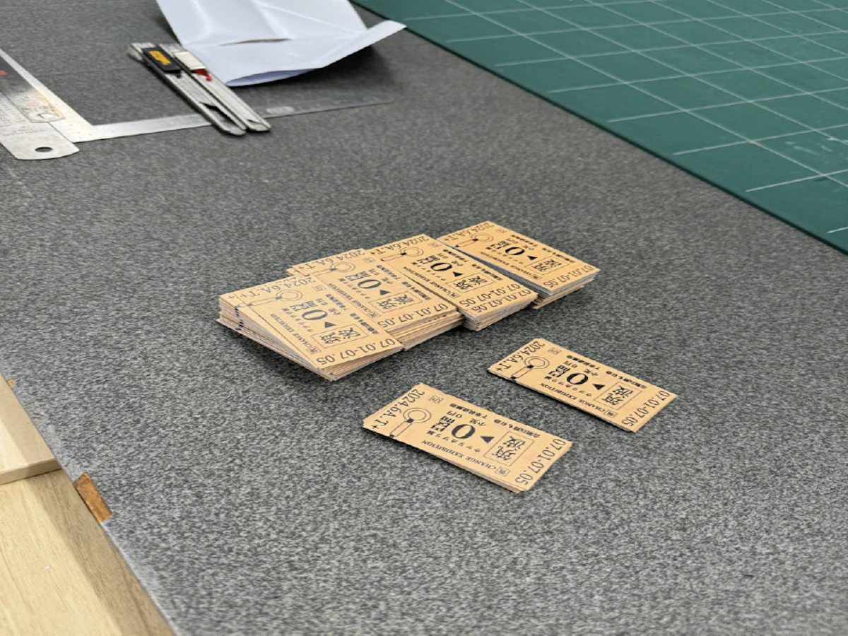 カッティングシートを使って、JR 線によくみられる「ラインカラー」を模した装飾を行った。また、中吊り広告や、電車内のステッカー、ノベルティの切符など、細かい要素をみんなで作り込んだ。