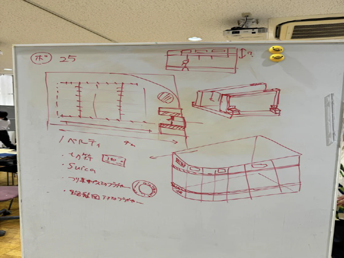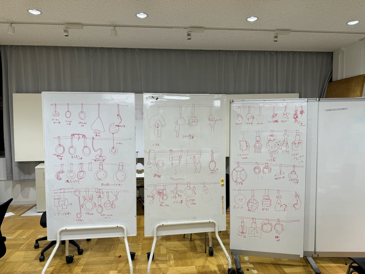 大学の有志たちと、「こんな吊り革はイヤだ」というお題で盛り上がったのをきっかけに、これを実際に作って展示してみたら面白のではないかという話になり企画。ホワイトボードに各々のアイデアを描き、かなりの数を作れそうなことがわかった。